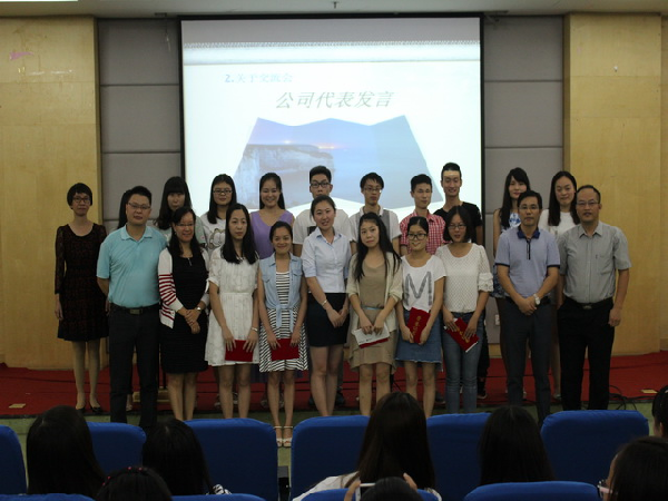 王华书记在致辞中结合我校“两有三实”人才培养理念,向与会同学阐发了社会实践的重要性,并代表我院实习基地上海恒进展览有限公司向今年参加暑期实习的15名同学颁发了荣誉证书。初占杰经理向各位同学介绍公司发展状况和实习就业岗位需求,并代表公司向实习业绩优秀的同学颁发了奖金。赴上海实习学生代表吴旭与师生分享了他们的实习心得,并号召其他同学一起脚踏实地参与社会实践,实现个人成长与抱负。13、14级学生代表温慧、王子洋分别结合个人心得与大家分享了暑期社会实践小分队的经历与成果。