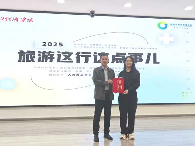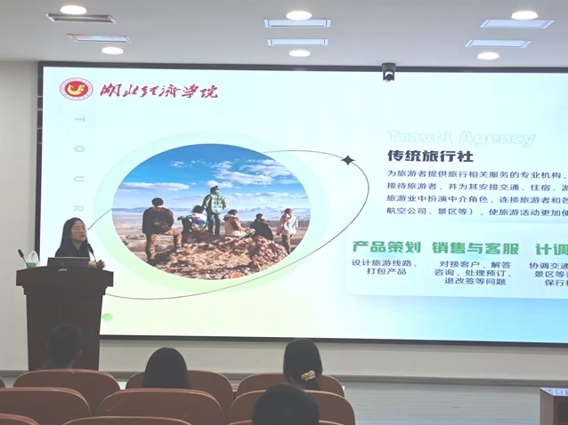 会上,林小莉结合自身学习及从事旅游行业的实践经历,以“旅游这行这点事儿”为主题,从大学生活、行业现状、行业领域、行业发展四个维度展开分享。在职业方向上,她详细解析了产品策划、计调、导游、旅游数据分析、景区运营等岗位的职责与能力要求,并结合武汉地区薪资参考数据,为学生职业规划提供了直观参考。互动环节中,林小莉针对同学提出的“多语种导游现状”的问题结合实际案例给出了细致的解答,帮助同学了解行业前沿信息。最后,她以“行千里,致广大”寄语2025级旅游管理专业学生,希望同学们以专业为舟,以热爱为帆,在旅游行业的广阔天地中探索边界、深耕领域,实现职业的价值与人生的成长。