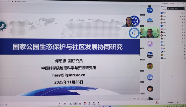 (供稿人:董茜;审稿人:陈立双)2025年11月26日,湖北经济学院旅游与酒店管理学院以线上方式举办专题学术讲座,主题聚焦国家公园生态保护与社区发展协同。讲座邀请中国科学院地理科学与资源研究所副研究员何思源作学术报告,学院师生线上参会交流。报告从国家公园体制建设的现实需求切入,指出在严格保护目标下,保护地内外的社区发展诉求、产业依赖与资源利用方式往往会使治理情境更为复杂,如何在生态保护与地方发展之间形成可操作的协同机制,是当前研究与实践共同面对的关键议题。