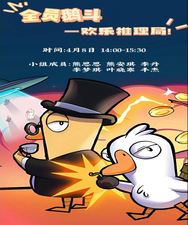 (供稿人:文超 审核:蒋昕)2026年4月8日下午14:00-15:30,在J2-212教室,会展项目管理实务课程小组成功组织了一场逻辑推理益智活动“全员鹅斗,欢乐推理局”。本次活动是课程“理论+实践”教学模式的重要实践环节,将课堂所学的活动策划、资源整合、风险管控、团队协作等核心知识转化为实战能力。从前期方案策划、预算编制、流程设计到现场执行与复盘总结,课程小组成员全程自主运作,在真实的项目管理场景中锤炼专业技能,实现了从“学习者”到“实践者”的角色跨越。