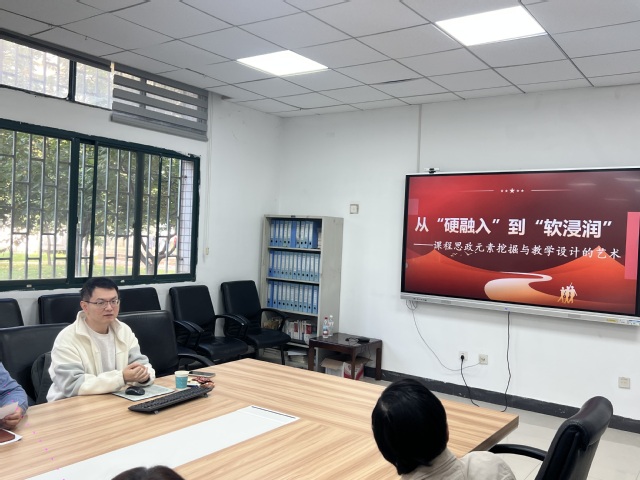 (供稿:赵丽祥 审核:蒋昕)为深化课程思政建设,推动专业课程与思政教育有机融合,切实提升教师课程思政教学设计能力,10月23日下午,我院课程思政结对教师、马克思主义学院叶欣明博士受邀为我院全体专任教师开展题为《从‘硬融入’到‘软浸润’:课程思政元素挖掘与教学设计的艺术” 》的专题讲座。讲座由我院副院长蒋昕主持,学院全体专任教师参加。
