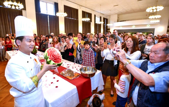 在中国美食绝技表演活动中,邹志平大师表演了快速雕西瓜刀工绝技,卢永良大师以大葱当毛笔书写“食为先”三字,并向来宾们展示了个人精彩的书法绘画作品。在美食品尝晚宴上,由卢永良、邹志平等六位中国烹饪大师设计制作的22道精美的菜点,不仅让200多位来宾大饱眼福和口福,而且深深体会到中国美食文化的博大精深。