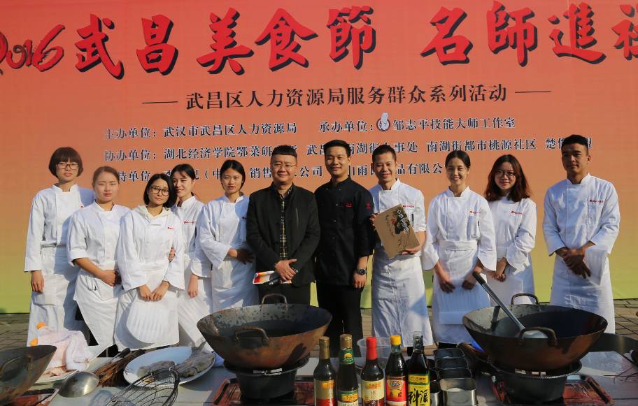“2016武昌美食节 名师进社区”活动由武昌区人力资源局主办,邹志平技能大师工作室承办,湖北经济学院鄂菜研究所、楚俊联盟、李锦记等单位协办。邹志平大师特别组织了100多位名厨到现场浓情献艺,楚天交通广播《好吃佬》节目主播陈阳友情担任主持人,南湖社区理发、美甲、医疗咨询等6支社区义工队、军鼓队热情助阵,还有来自湖北经济学院烹饪专业8名大学生志愿者,携手为本次活动增添了一道道靓丽的风景。